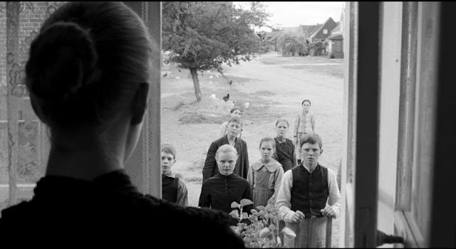 Todo um clima de opressão e desconfiança circunda o cotidiano dos personagens. Temos o barão local, proprietário de todos os meios de produção, e seus vassalos, os camponeses; temos as crianças, que para se verem purgadas de suas transgressões são obrigadas a usar uma fita branca, uma insígnia de pureza e redenção, uma correspondência direta com a estrela de Davi usada pelos judeus na Alemanha nazista.