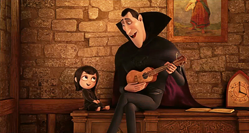 | Algumas cenas conseguem ser engraçadas pela imprevisibilidade, como o Conde Drácula tocando ukulelê para a sua sua filha, Mavis. |