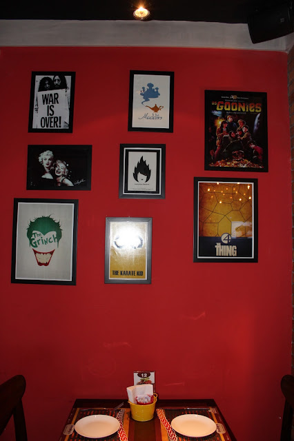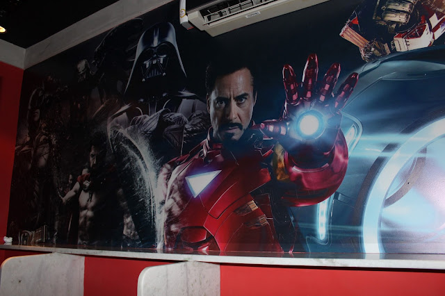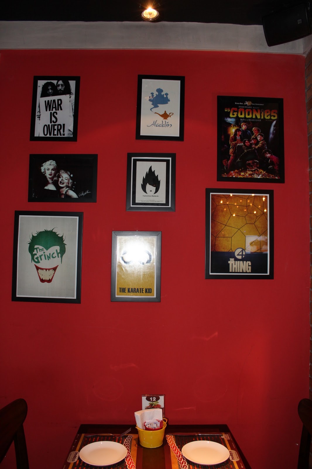A iluminação e os pequenos detalhes (como o teto, que lembra uma estrutura utilizada em estúdios) chamam atenção, mas o que me fez passar minutos encantada foram os vários quadros que decoram o ambiente, todos eles inspirados no cinema. Alguns brincam e desafiam o cinéfilo, misturando personagens e cartazes de filmes, como por exemplo Magneto, de X-men, e O Poderoso Chefão, e o Grinch (interpretado por Jim Carrey) e Coringa (Batman).