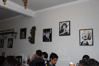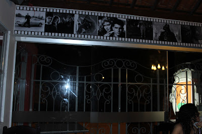 Quando minha irmã falou que tinha ido comer em um lugar que era “a minha cara”, não imaginei que ela estaria tão certa. Logo que cheguei a pizzaria Vila de Belmonte fui encantada pela temática aliada à criatividade da decoração do local. A arquitetura é de uma casa antiga, de um andar e com cômodos grandes, o que torna o espaço aconchegante e lhe dá um aspecto clássico. Nas paredes, fotos de atores, atrizes e diretores hollywoodianos, além de cartazes de filmes e imagens dos antigos cinemas de rua da cidade.