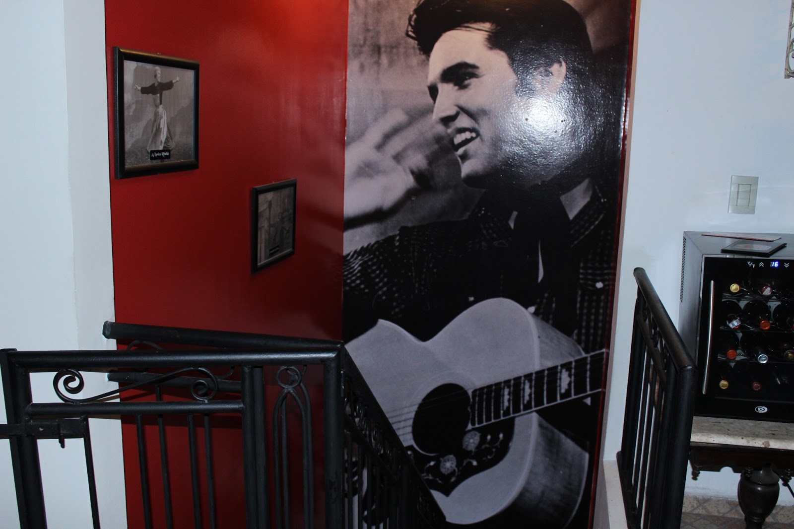 Próximo às escadas, também encontramos homenagens aos estúdios clássicos como MGM e 21th Century Fox, e ao escalá-la, há uma fotografia de Elvis Presley cobrindo toda a parede.